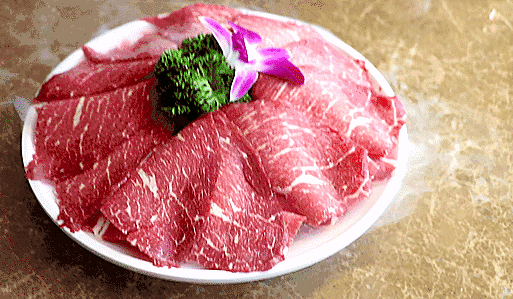 肉片片切得很薄,肥瘦相间,稍微下锅涮下就可以吃。