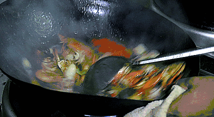 螃蟹入锅后需快速翻炒 ,锁住蟹肉中的汤汁