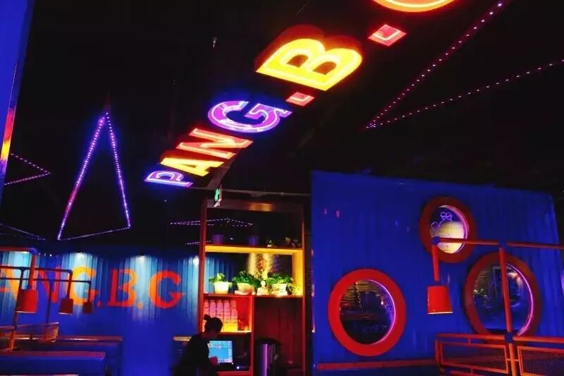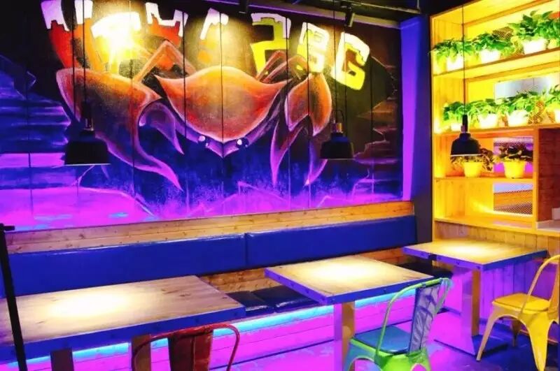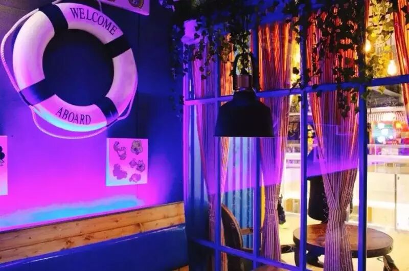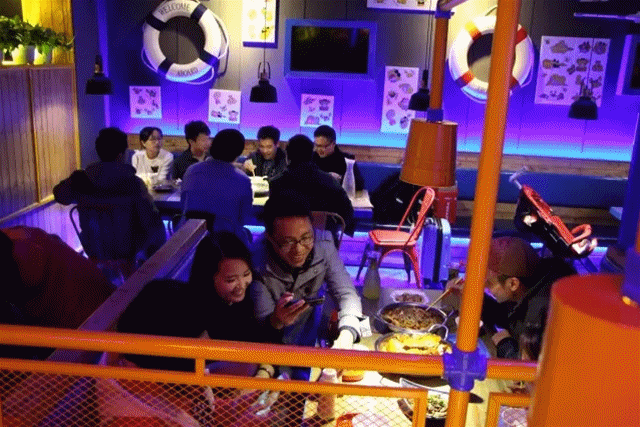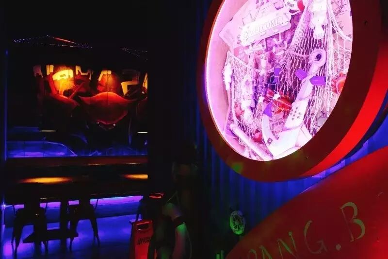 海洋风和神秘的蓝色灯光,吃饭就好像在潜水艇里约会!