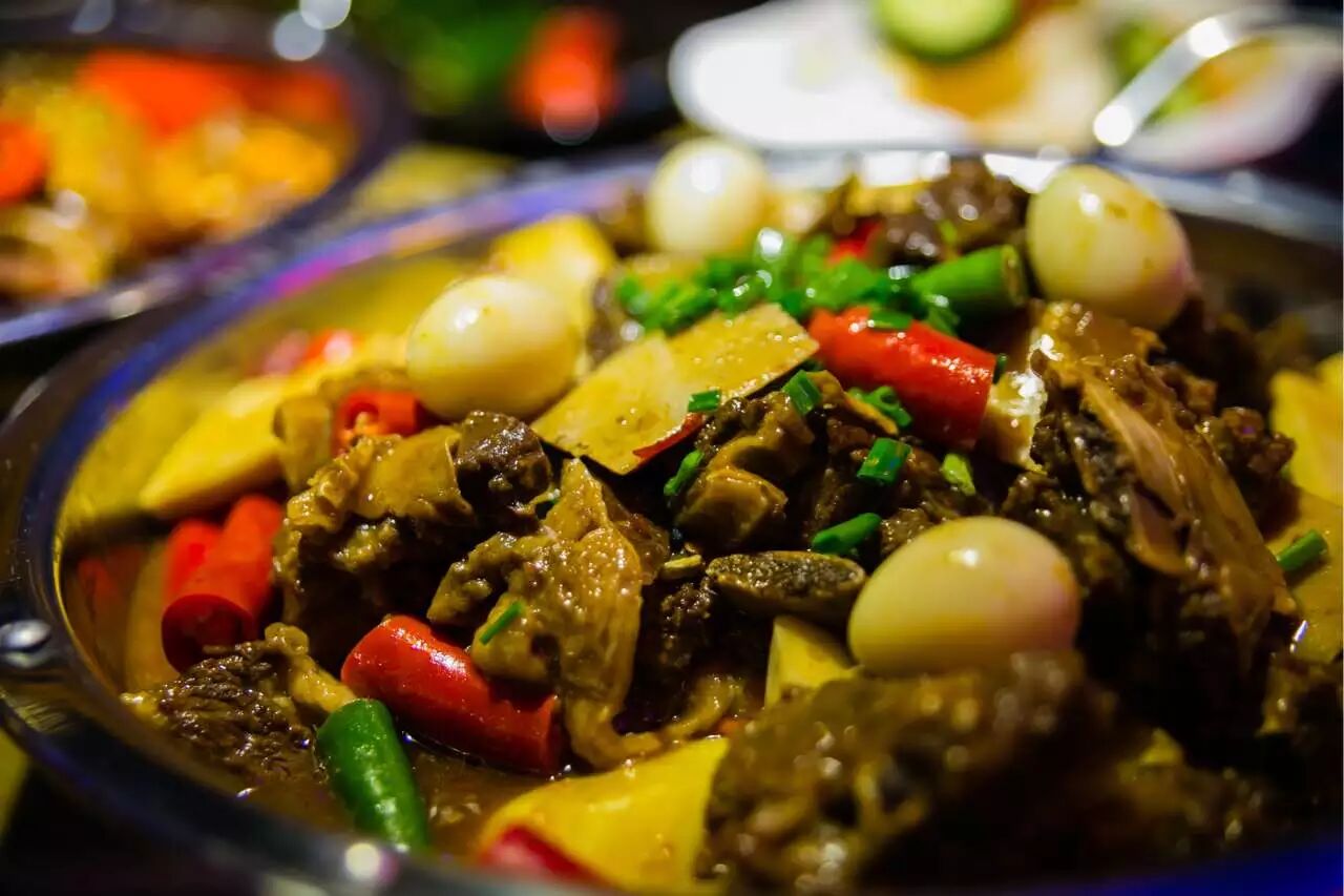 这锅牛排煲,选用的是农垦牛肉,香嫩弹鲜,肉汁饱满。加上浓郁的酱汁,仔细看每一条纹路都在泛光~超诱人~垫满了土豆、鹌鹑蛋、千叶豆腐等辅料!!千页豆腐的爽滑,土豆的酥烂......总有一款让你欲罢不能!