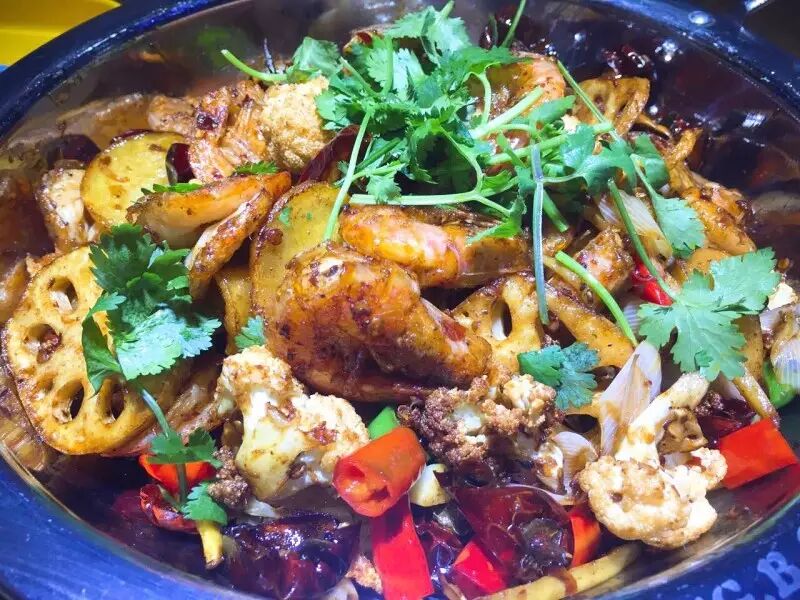 锅底下面全是满满菜花、莲藕、土豆....中间配以大虾陪衬,虾肉肉质紧韧爽脆,色泽金黄,味鲜浓郁,香而不腻、辣而不呛! 香辣入味,好吃到飞起!