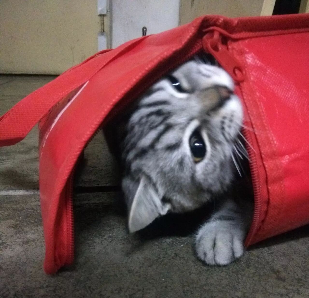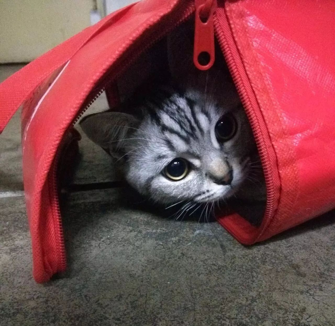 有次我怎么叫卤煮都没有动静,我在小房子里找了一圈也没找着,正心慌意乱之际发现了地上的香辣蟹袋子,掀开一看,卤煮安静、端正地趴在里边睁着无辜的大眼睛。