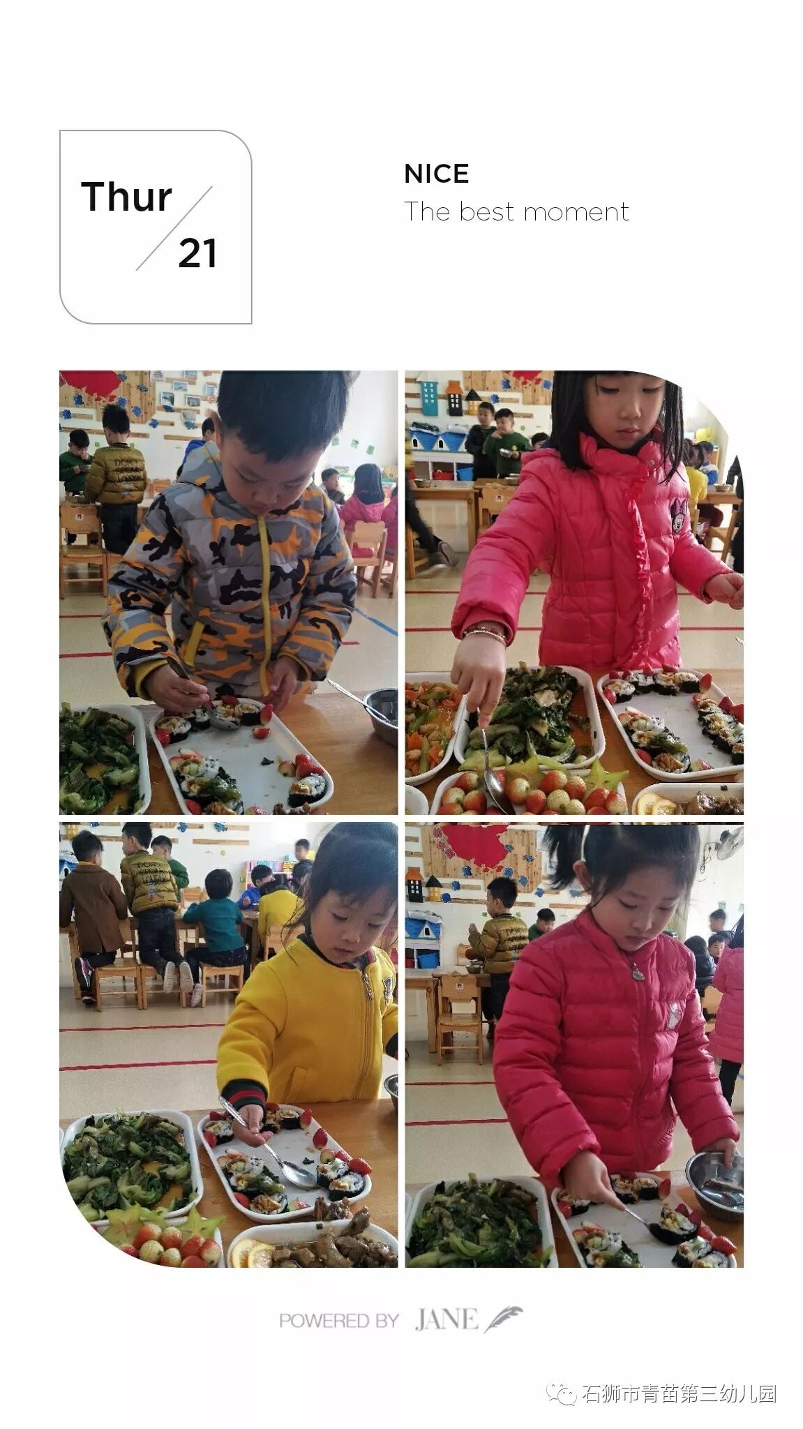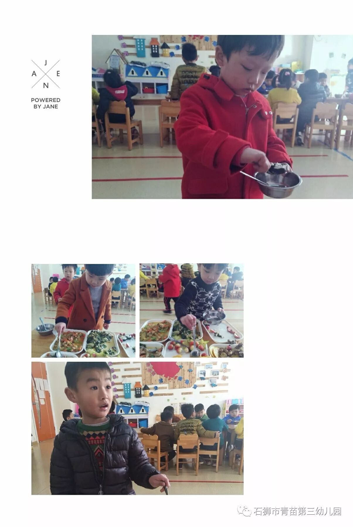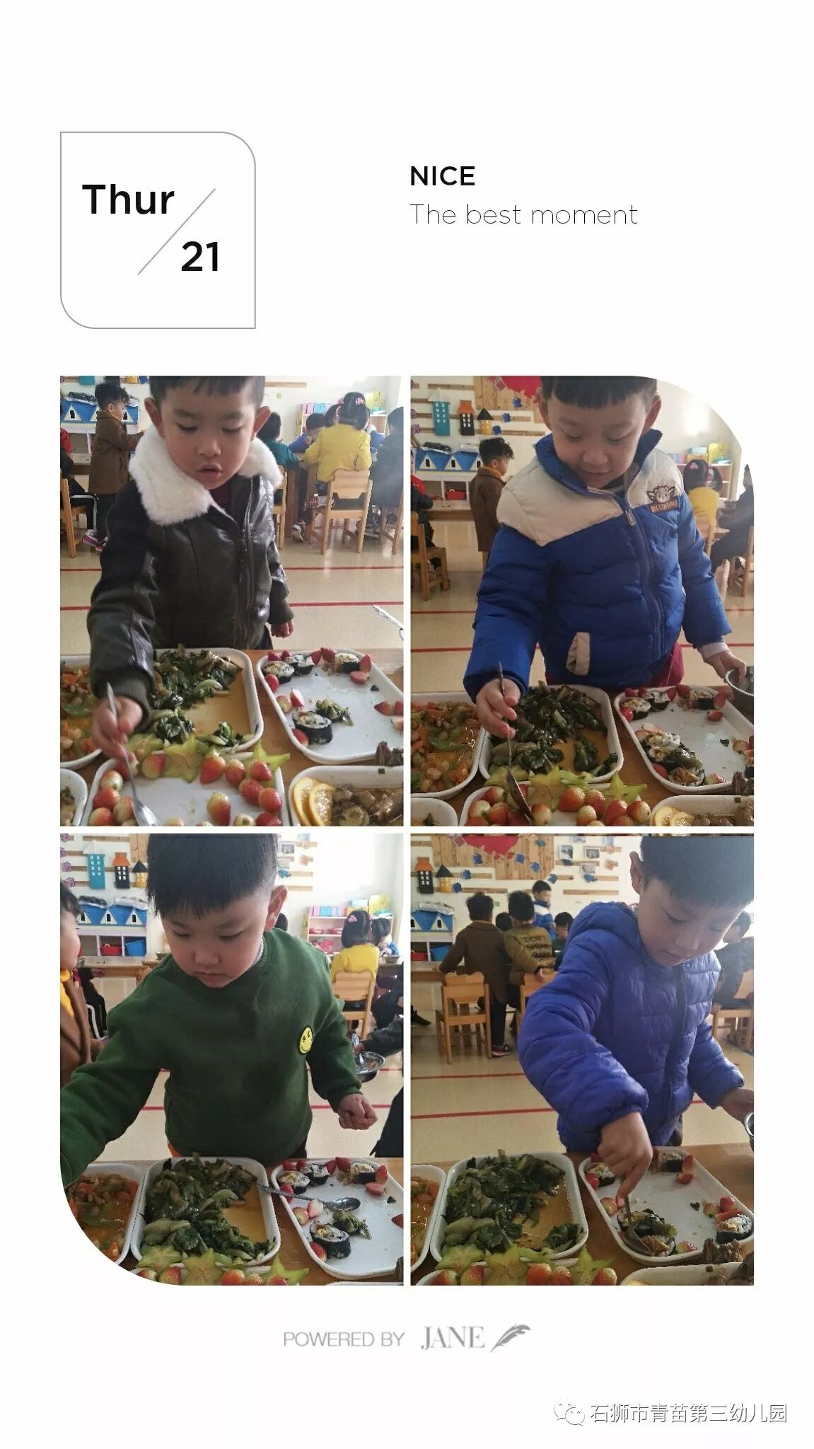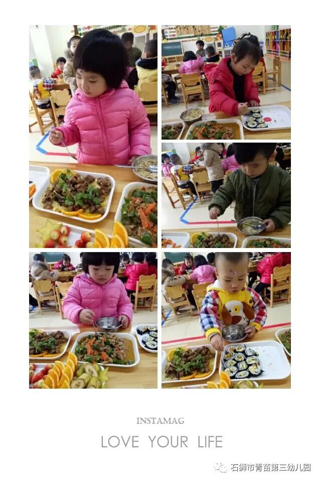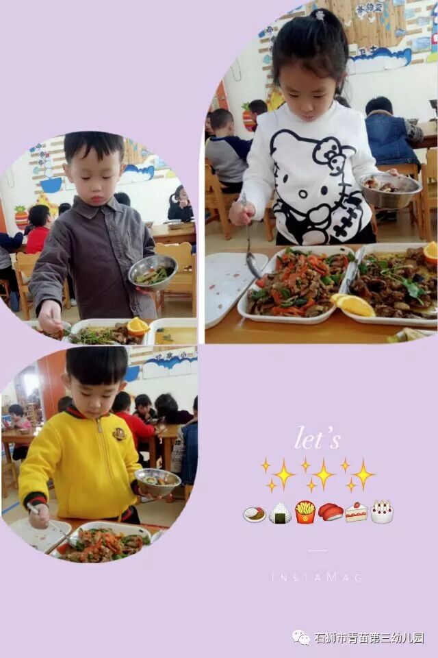 让幼儿通过开放式的、自由交流活动,了解食物的分类、搭配,懂得了如何科学地摄取营养的小知识,以及化被动吃饭为主动吃饭,让孩子拥有一个健康的身体。还可以从中让孩子学习一些自助餐礼仪,如:拿好自己的餐具,用公用的匙子盛食物,并且吃多少盛多少,不浪费食物等。看看孩子的表现吧: