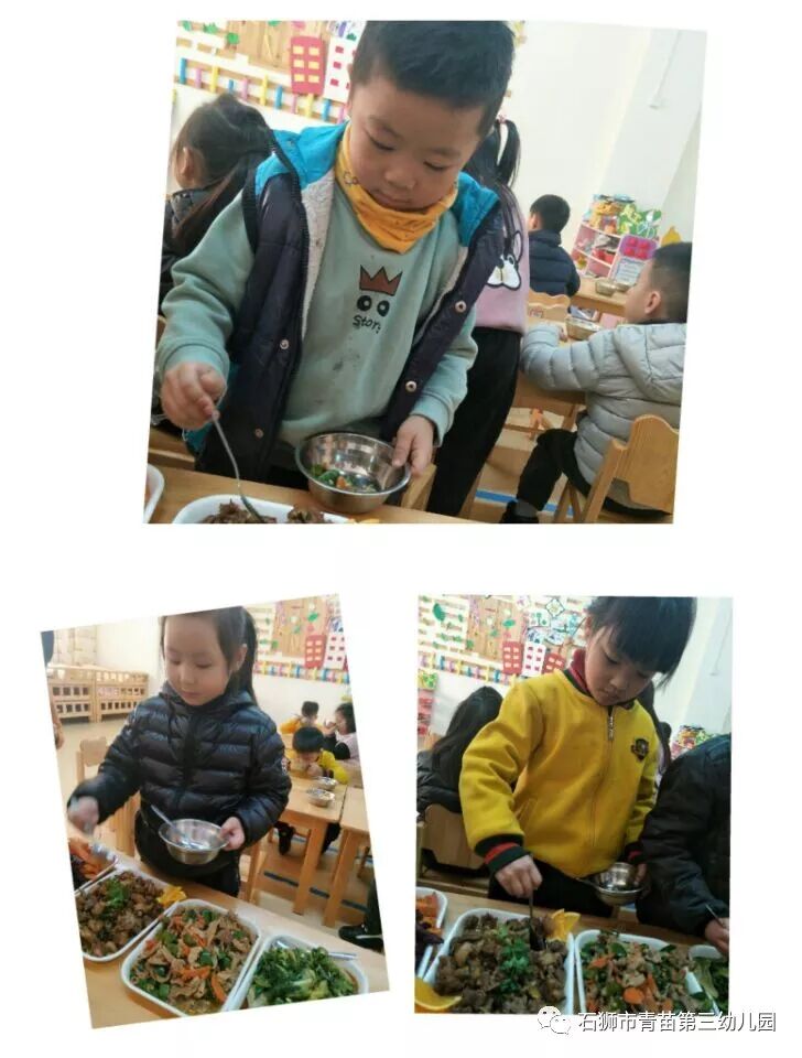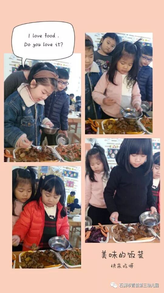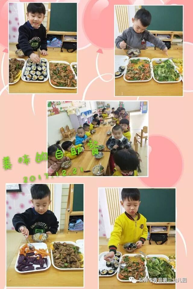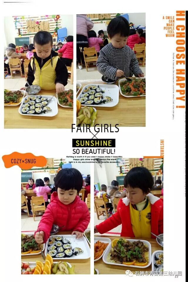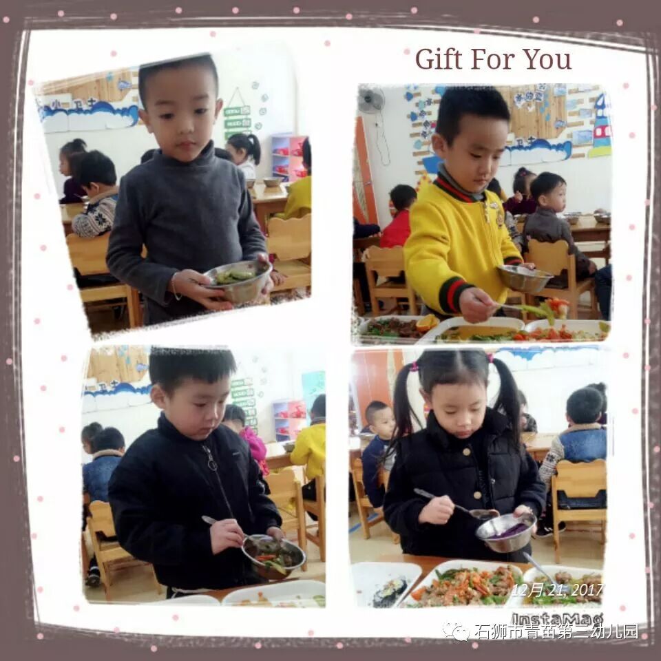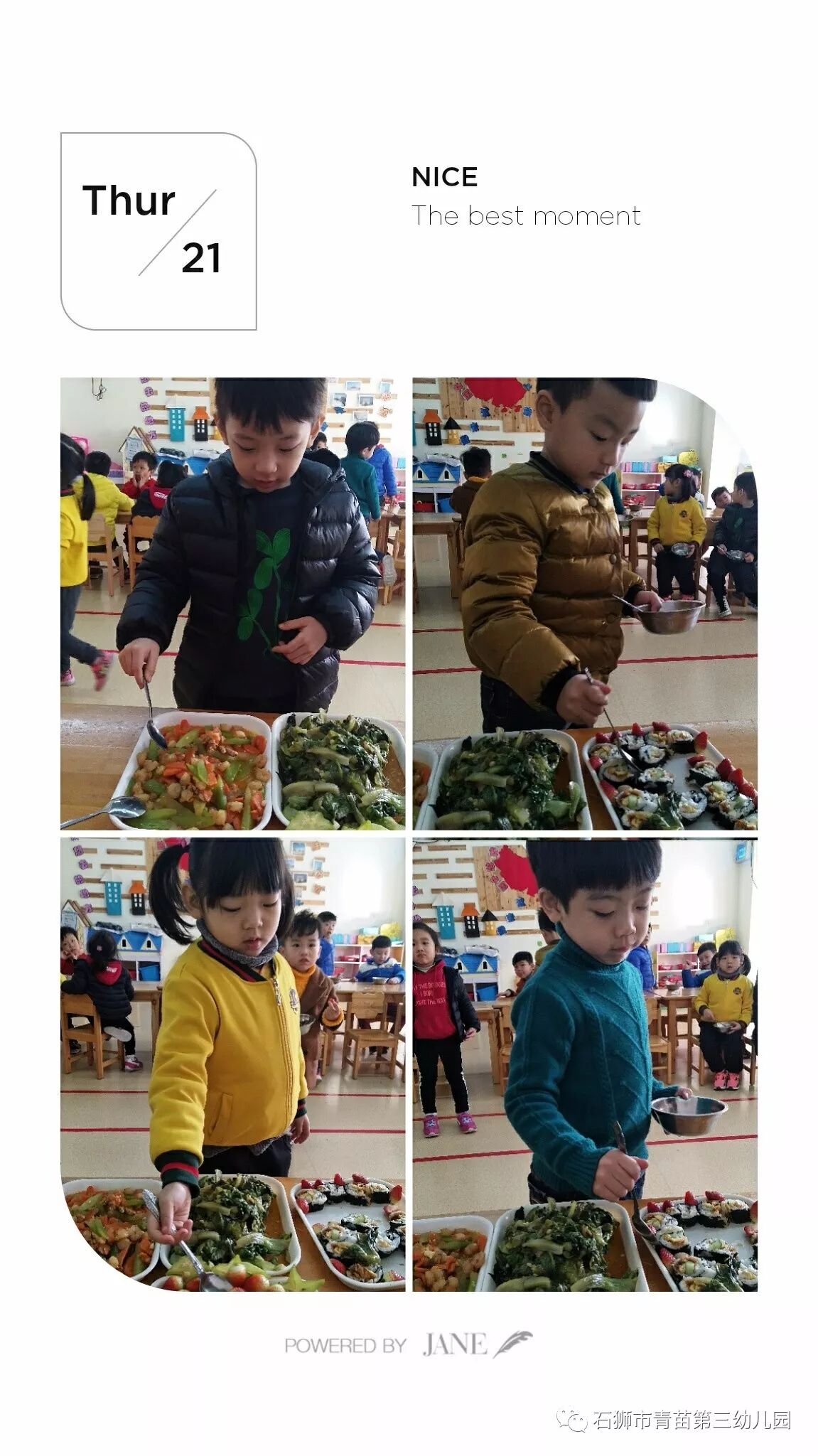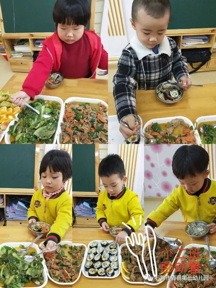 让幼儿通过开放式的、自由交流活动,了解食物的分类、搭配,懂得了如何科学地摄取营养的小知识,以及化被动吃饭为主动吃饭,让孩子拥有一个健康的身体。还可以从中让孩子学习一些自助餐礼仪,如:拿好自己的餐具,用公用的匙子盛食物,并且吃多少盛多少,不浪费食物等。看看孩子的表现吧: