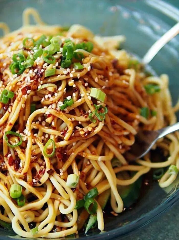 4、把酱汁倒在面条上拌匀,黄瓜丝、胡萝卜丝、鸡胸肉丝摆放在面条上,撒上葱末和黑芝麻即可。