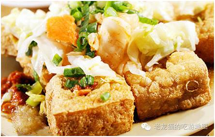 台湾泡菜臭豆腐源自大陆,其表面酥脆,而里面有很多孔洞,台湾臭豆腐还要配上专门的泡菜,泡菜是采用圆白菜淹制而成,吃起来爽脆,酸酸甜甜的。酱汁也和大陆不同,台式臭豆腐的酱汁是分别淋上的,有蒜末汁,酱油,麻油,辣椒酱.......等等。