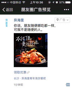 ▼异海里青年海货餐吧朋友圈广告落地页示意