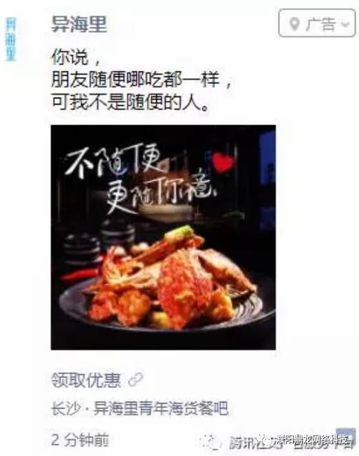 异海里的品牌经理金彬也坦言异海里青年海货餐吧是一个新品牌,前提肯定是要做曝光,而为何第一个投放平台就选择了微信朋友圈广告,是因为他看中了朋友圈广告的这些特点: