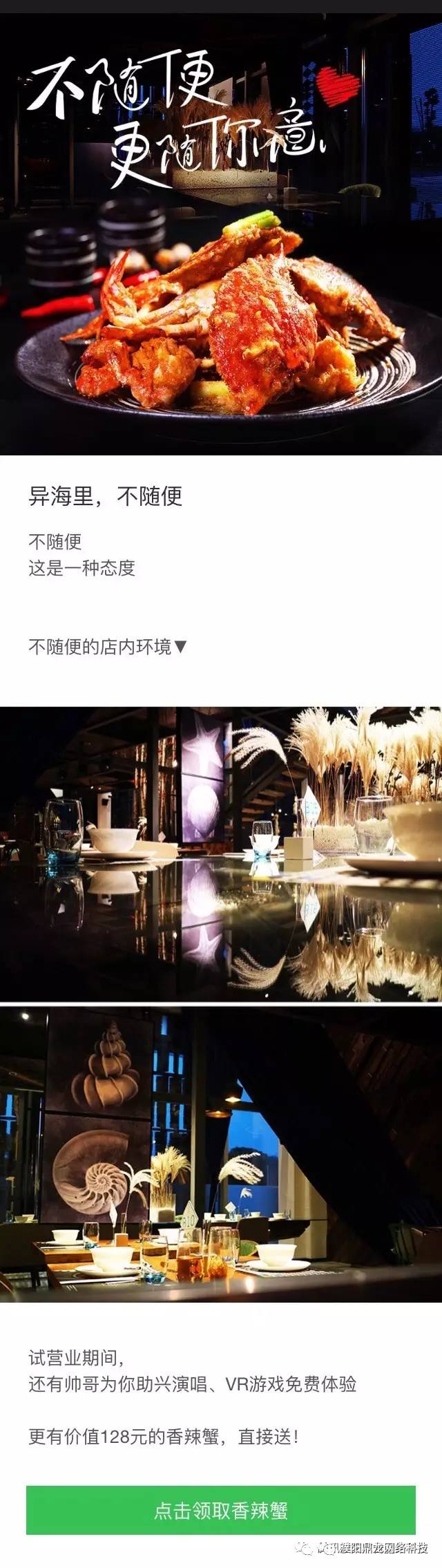 外层素材点击图片和文字即可进入落地页,除了有异海里餐厅环境展示,落地页的底部还有领取优惠的按钮,点击直接跳转公众号文章领取128元的香辣蟹卡券。到店即送128元的香辣蟹,简单直接地刺激了目标用户,再加上好菜品,好环境,他们愿意到店消费。