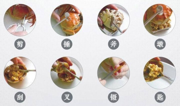 明代有一个叫漕书的人,他为了吃蟹更加方便畅快,创造了锤、刀、钳三件工具来对付蟹的硬壳,后来逐渐发展到八件。「蟹八件」的产生,完全提升了吃蟹的品位,更契合江南人的优雅风趣之道。如果觉得用蟹八件太复杂,你也可以选择徒手上阵!