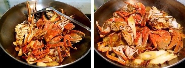 ⑤ 味道出来后,下入炸好的蟹块、葱节,并加入调味香油和鸡精调味炒匀出锅,撒上香菜节便可上桌。