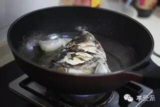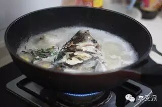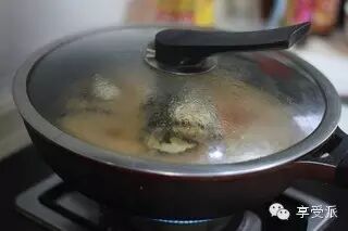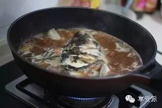 盖上锅盖,大火烧,期间间隔地将汤汁浇在鱼头表面。