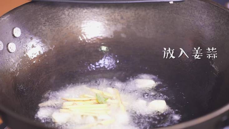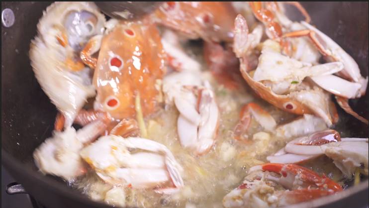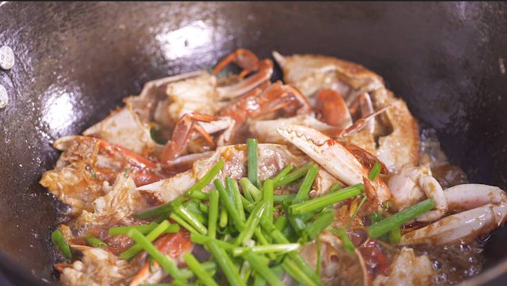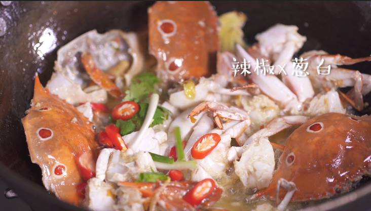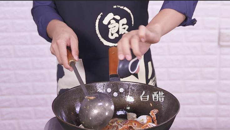 4.螃蟹入锅爆炒至金黄色,加入白醋、辣椒、葱白段炒香;