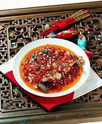 剁椒鱼头这道菜,也被称作"鸿运当头"、"开门红",它的来历和清代著名文人黄宗宪有关。据说清朝雍正年间,黄宗宪为了躲避文字狱,逃到湖南一个小村子,借住农户家。这家人很穷,买不起菜,幸好晚上吃饭前,农户的儿子捞了一条河鱼回家。于是,女主人就在鱼肉里面放盐煮汤,再将辣椒剁碎后与鱼头同蒸。黄宗宪觉得非常鲜美,从此对鱼头情有独钟。避难结束后,他让家里厨师加以改良,就成了今天的名菜剁椒鱼头。