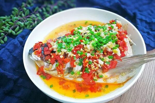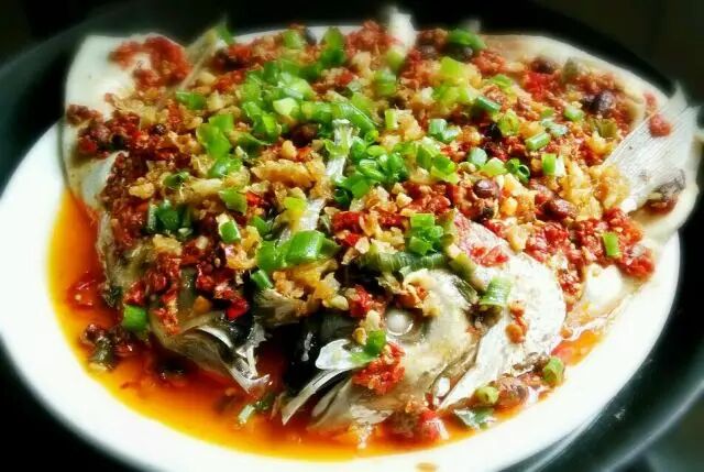 将蒜茸和葱碎铺在鱼头上,再蒸一分钟。从锅中取出碗后,再将炒锅置火上放油烧至十成热,铲起淋在鱼头上即成。