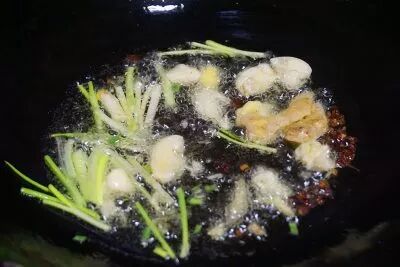 3、锅内倒油烧热至6成时,下花椒粒、大蒜、老姜、葱白爆香