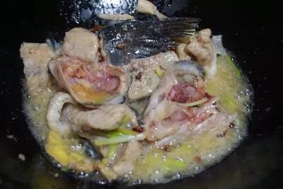 4、然后下入鱼头,倒入料酒翻炒2-3分钟,下入适量清水煮沸后放丝瓜煮熟