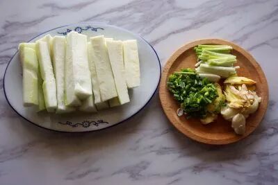 2、丝瓜切成4-5厘米长的段;老姜、大蒜拍碎;葱白切成段;葱叶切成花待用4.然后下入鱼头,倒入料酒翻炒2-3分钟,下入适量清水煮沸后放丝瓜煮熟5.临出锅前撒盐、白胡椒粉调味,装盘后撒上葱花即可食用