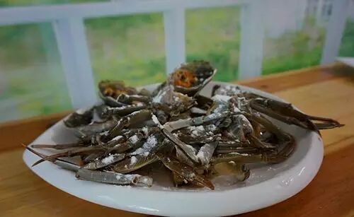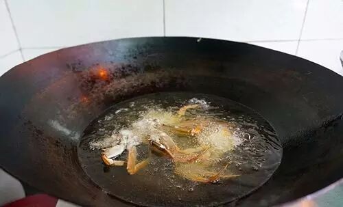 6. 锅里上少许油,烧制七成热,放入腌制好的蟹炸制金黄色,然后捞出来备用