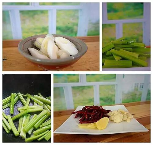 5. 准备配菜,将洗净后的西芹段过下油、大葱、辣椒等洗干净切小段沥干水备用,