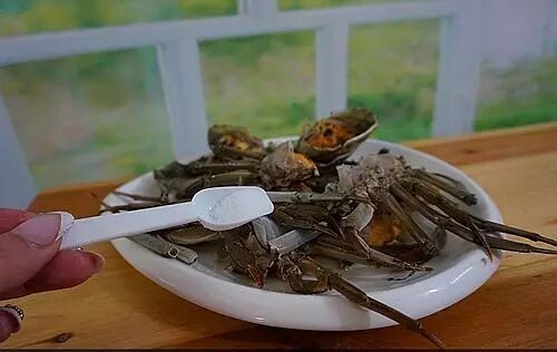 3. 处理好的蟹放入少许盐,适量的白酒,用手均匀的撒入,白酒有很好的去腥作用,还能提香,腌制大概十分钟左右