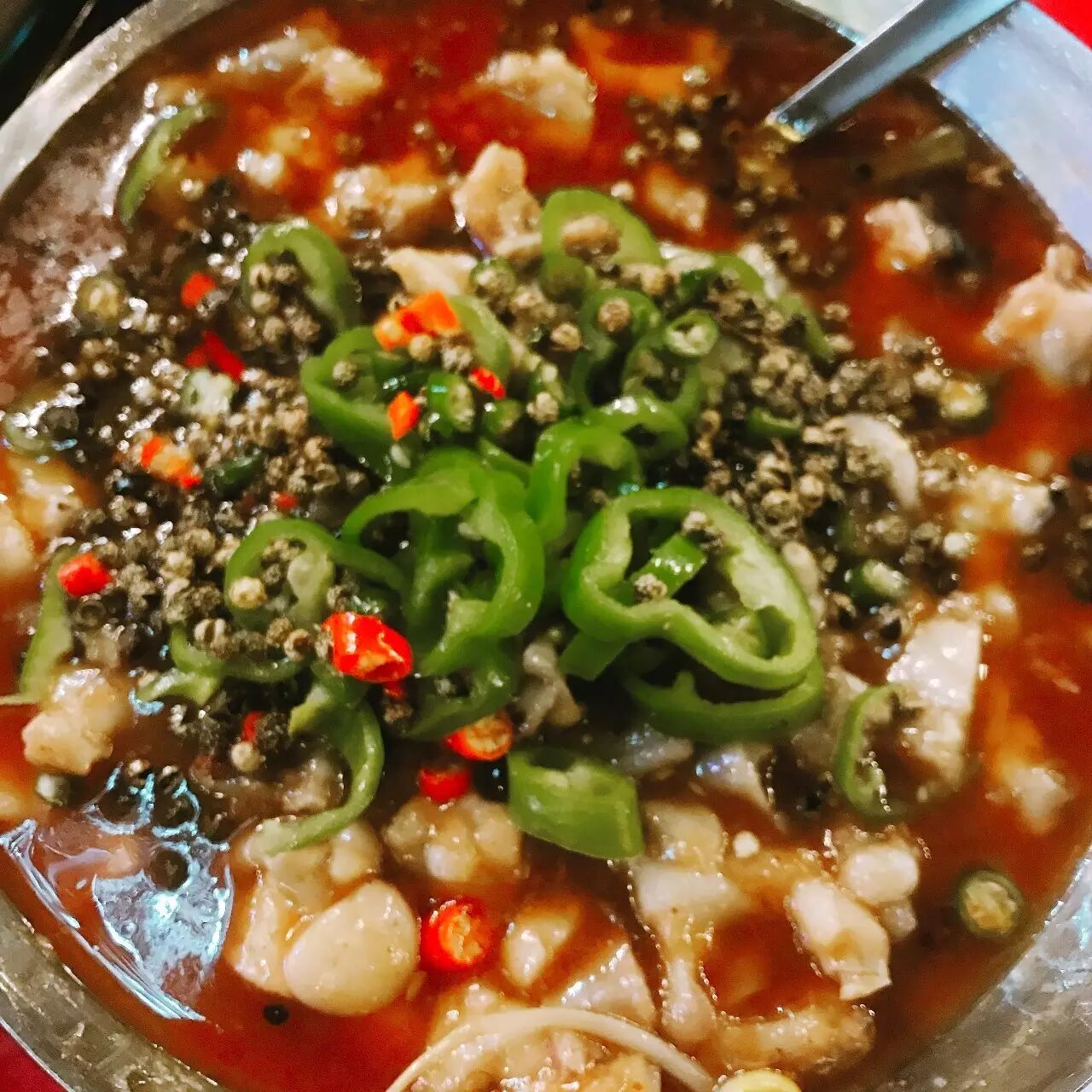 这道菜是用烤鱼的容器上桌,下面有明火继续加热。所以不要急着吃,再略煮一会,翻一翻,味道才会全部出来。肥肠,鲜香厚重、质感香醇、毫无腥气。鸡肉,油香深深浸入纹理之中,软而不烂。加上土豆、木耳、藕、腐竹以及香菜的陪衬,口感极为丰富,是一道硬气的下饭菜。同样的,可以随时加辣,还可以添加其他配菜,一道菜喂饱一桌人,就是如此。
