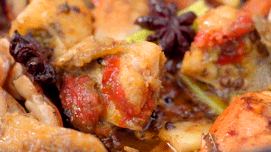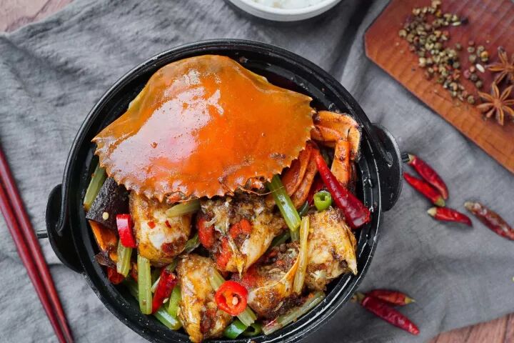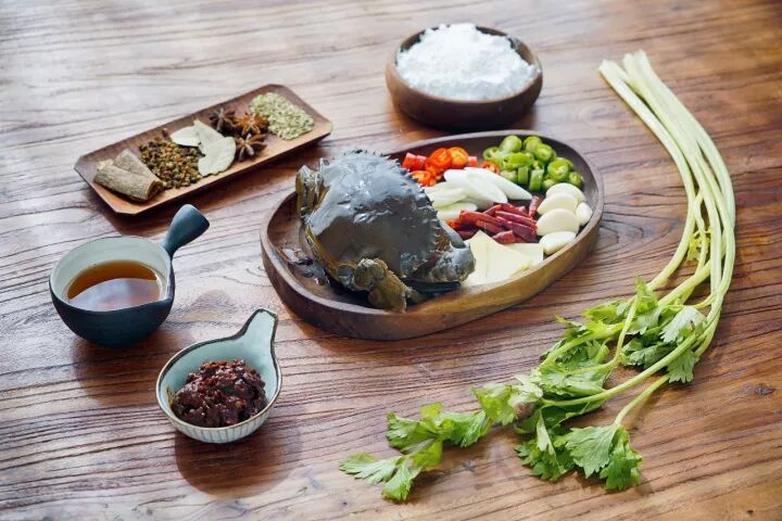 膏蟹 / 香芹 / 姜葱蒜 / 花椒粒 / 郫县豆瓣酱 / 青红尖椒