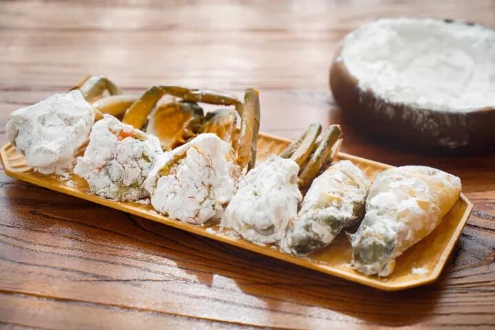 1、膏蟹(雌青蟹)洗净剪钳,用刀背敲出裂痕,剥蟹掩,开蟹盖去蟹胃、蟹身两侧的蟹腮及当中的蟹心。处理好的蟹身一分为四,蟹钳和蟹身切面处都均匀裹上适量淀粉,备用。