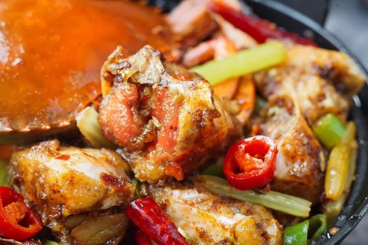 5、开盖,下适量青红尖椒圈和香芹段略微翻炒,盛出,淋上酱汁,香辣蟹完成!