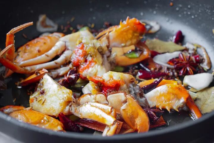 4、倒入煎好的蟹身和蟹钳翻炒5分钟,倒入1勺料酒烹香,加1勺郫县豆瓣酱和少许盐调味,再倒入小半碗清水,加盖小火焖煮8分钟。