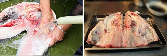 3、把鱼腹内的黑膜清洗干净;切下大鱼头,清洗干净;