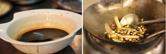 6、加入一手勺的料汁,大火翻炒出香味;