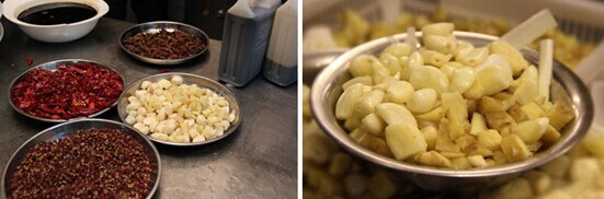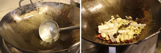 5、开火烧热大铁锅,然后倒入半手勺油,油热后放入花椒炸出香味,依次放入辣椒段、葱姜蒜,最后放八角,大火爆香;