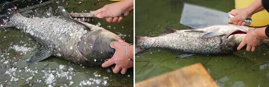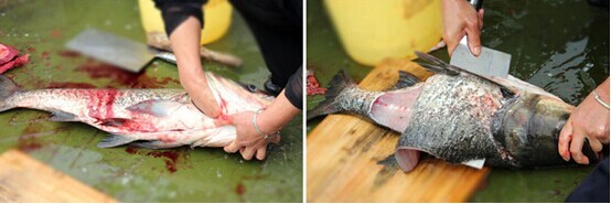 1、新鲜的鳙鱼(胖头鱼)用钢刷去掉鱼鳞,破开鱼腹,掏干净内脏;