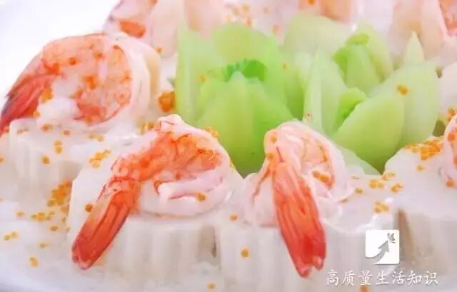 原料:内脂豆腐1盒、鲜虾150g、料酒1勺、蟹籽10克、盐1勺