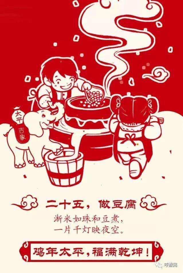 腊月二十五还有另外一个典故。这一天家家户户做豆腐,源自清代百姓对奸臣和珅的抗争。因为那个年代老百姓特别恨腐败,就想跟腐败做斗争。怎么办?于是就在这天要做豆腐。春节吃豆腐(斗腐)就是跟腐败做斗争。
