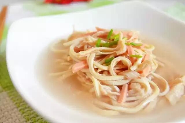 北京东安市场拐角处解放前有一家肉店宝华春,兼卖南味熟肉,卖一种酒菜:豆腐皮切细条,在酱肉汤中煮透,捞出,晾至微干,很好吃,不贵。现在宝华春已经没有了。豆腐皮可做汤。炖酥腰(猪腰炖汤)里放一点豆腐皮,则汤色雪白。