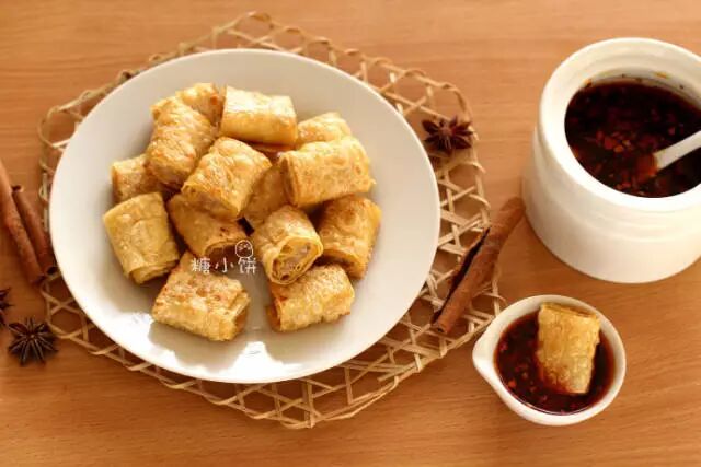 杭州知味观有一道名菜: 炸响铃。豆腐皮(如过干,要少润一点水),瘦肉剁成细馅,加葱花细姜末,入盐,把肉馅包在豆腐皮内,成一卷,用刀剁成寸许长的小段,下油锅炸得馅熟皮酥,即可捞出。油温不可太高,太高豆皮易煳。这菜嚼起来发脆响,形略似铃,故名响铃。做法其实并不复杂。肉剁极碎,成泥状(最好用刀背剁),平摊在豆腐皮上,折叠起来,如小钱包大,入油炸,亦佳。不入油炸,而以酱油冬菇汤煮,豆皮层中有汁,甚美。