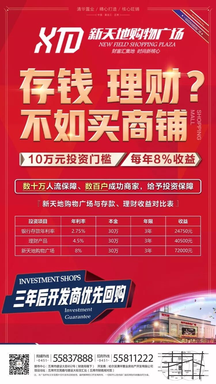 别的商场需要招商家,新天地购物广场是在挑商家,完工即开业,开业即赚钱,由于五层销售火爆,剩余房源不多,1月1日元旦起将全面涨价,即买即收益,机不可失,失不再来,销售热线,55837888 55837888