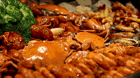海底世界三号(需提前8小时预约):食材有花甲、鲍鱼、青口、扇贝、带子、基围虾、肉蟹、小龙虾等海鲜,搭配热干面、豆芽,西兰花等蔬菜。