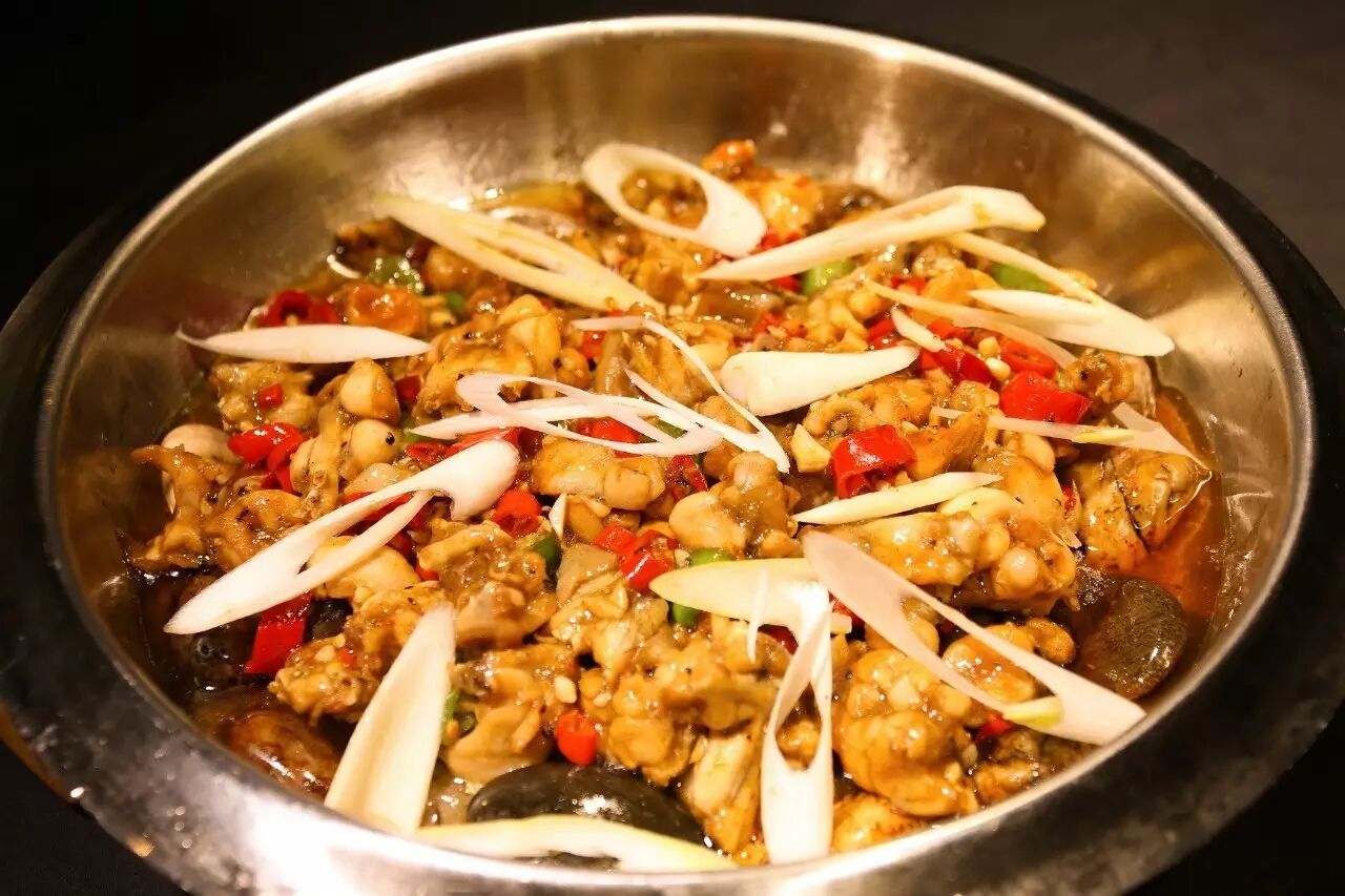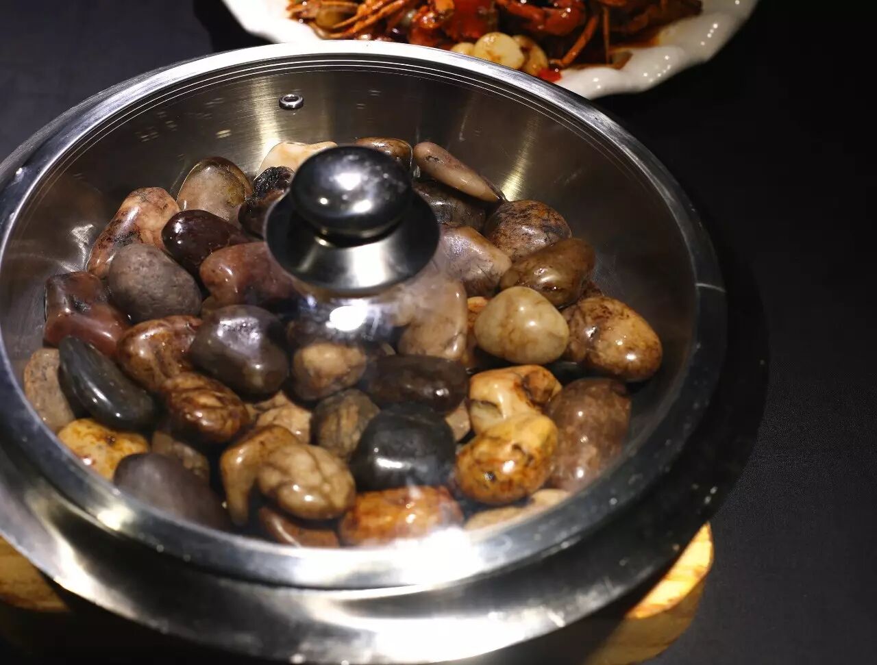 5、将加热好的雨花石端上餐桌,依次倒入大葱、肉蟹、加上锅盖焖上10秒,大功告成!