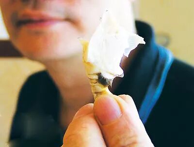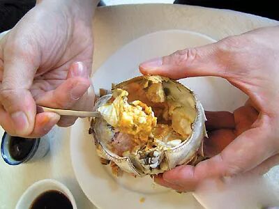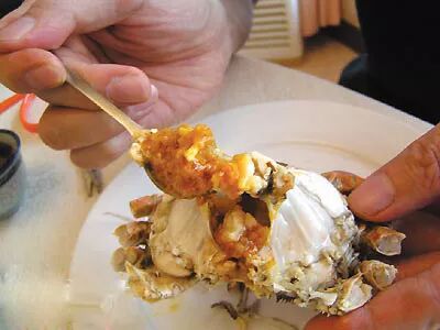 3、先吃蟹盖部分,用小勺把中间的蟹胃部分舀出,轻轻将外面包裹着的蟹黄吮干净。注意,不要吮破中间那个呈三角锥形的蟹胃,应将其丢弃。