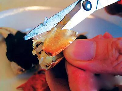 4、吃完蟹盖轮到蟹身,先用剪刀将多余的蟹脚、蟹嘴和蟹肺剪掉。