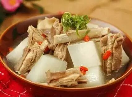 2.将排骨炖至肉脱骨,再加入萝卜,葱炖熟,撇去汤面浮油,加入精盐适量即可。