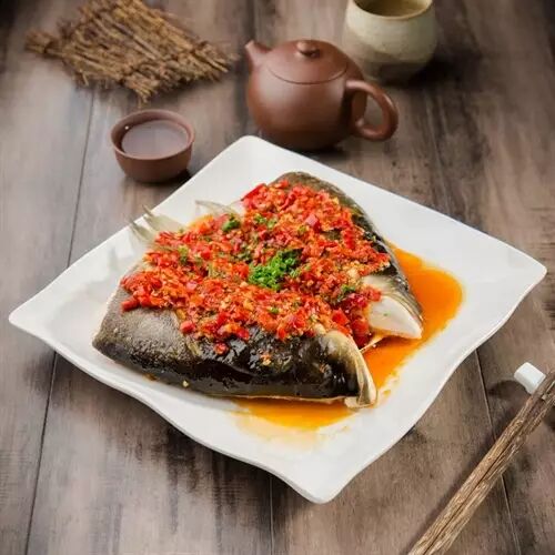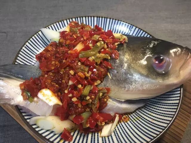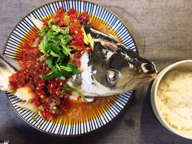 3. 蒸锅上火,水开后放入鱼头,大火蒸10分钟,关火蒸汽焖2分钟。把鱼端下来,浇半勺蒸鱼豉汁;