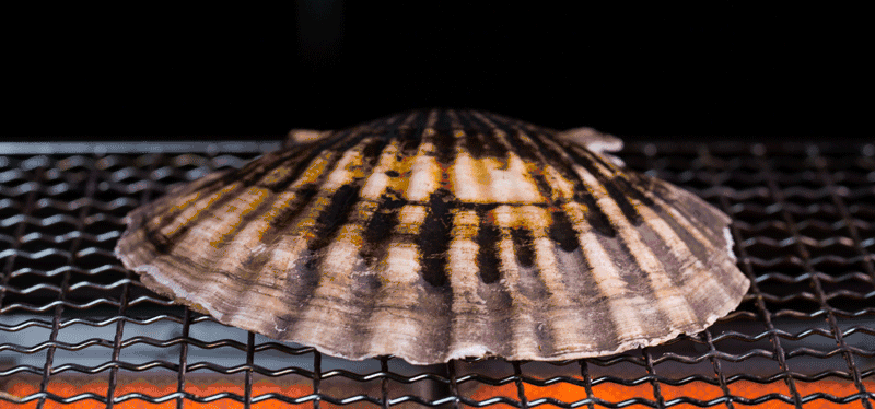 扇贝,有市面上一个半大,放在炭火上炙火攻击