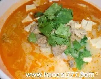 原料:羊骨头汤、羊肉、豆腐、料酒、花椒粒、盐、味精、大蒜、大葱、生姜各适量。