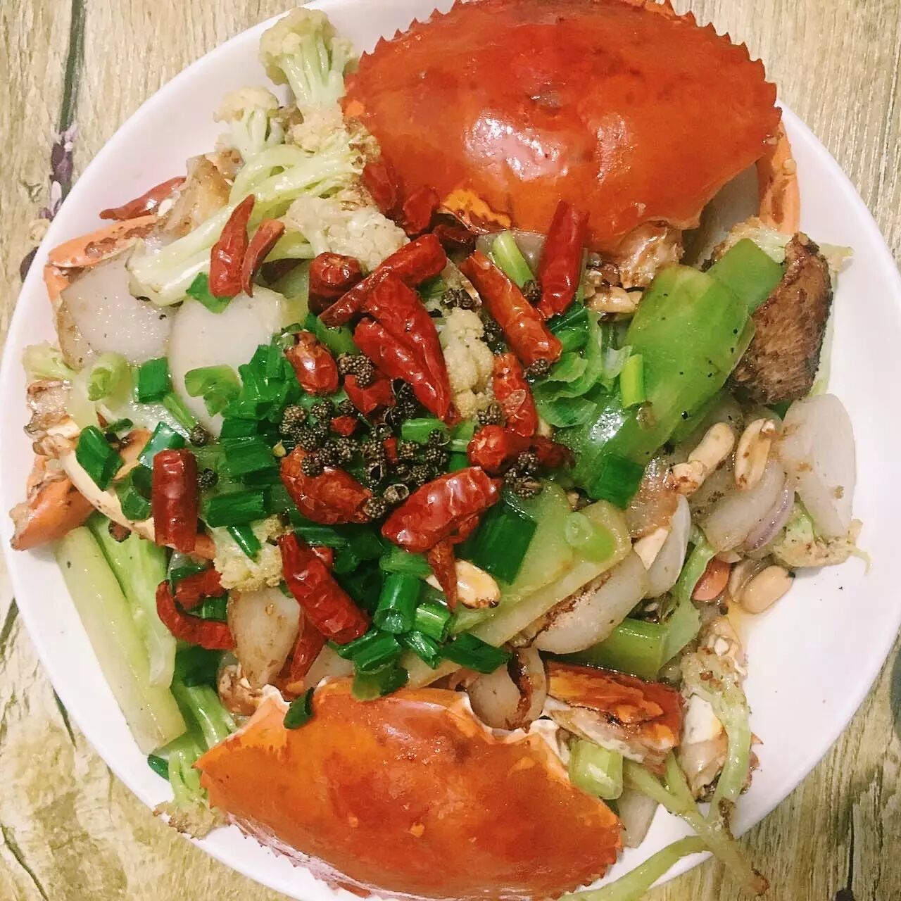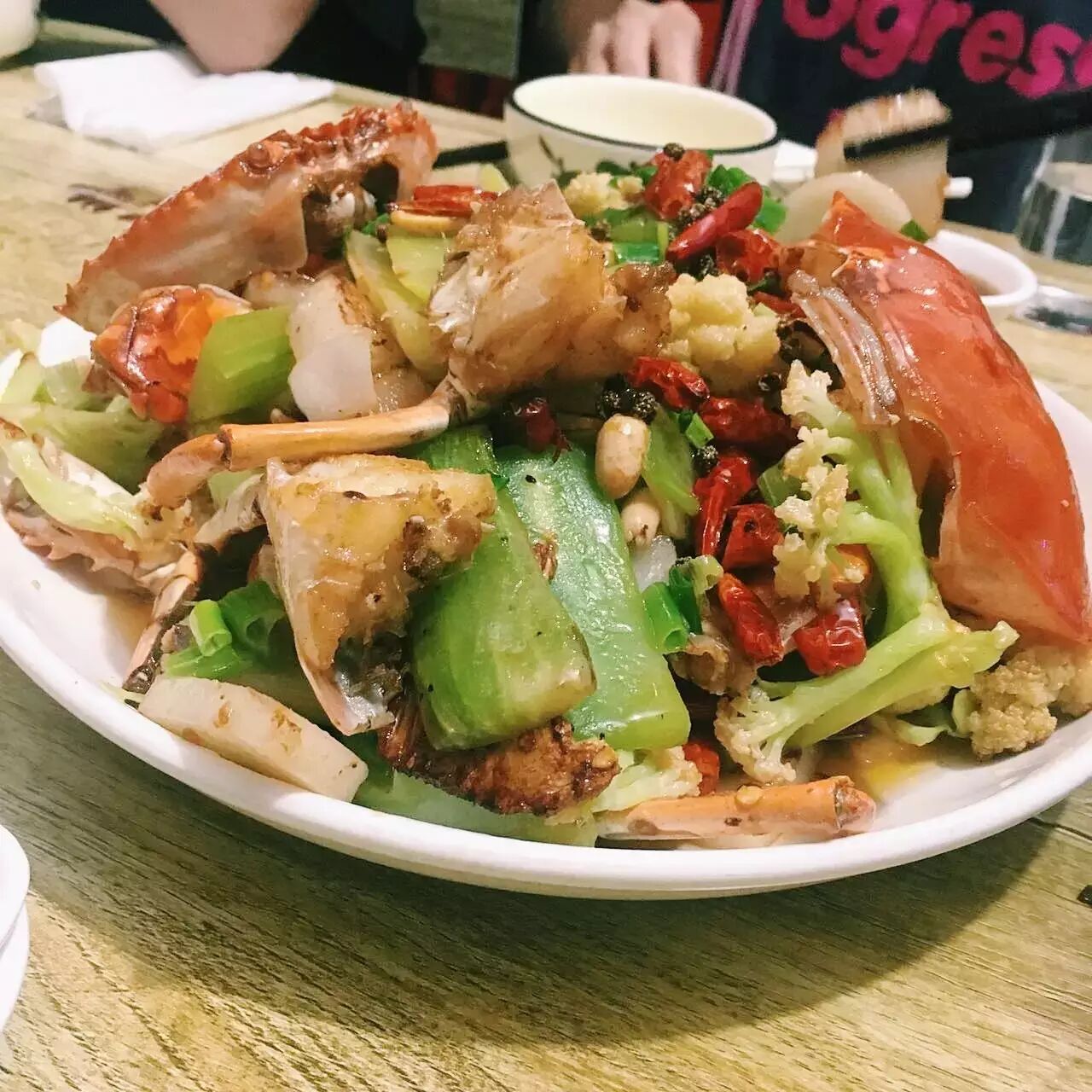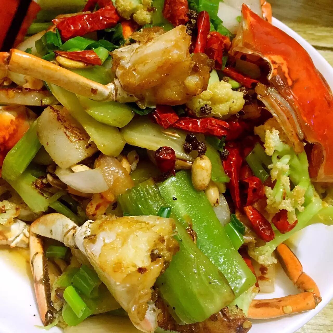 先吃着冷菜,没多久,香辣蟹就上桌了。香,真的是香,光闻着味儿,便把持不住了。再看着色泽,又让人食欲大增。