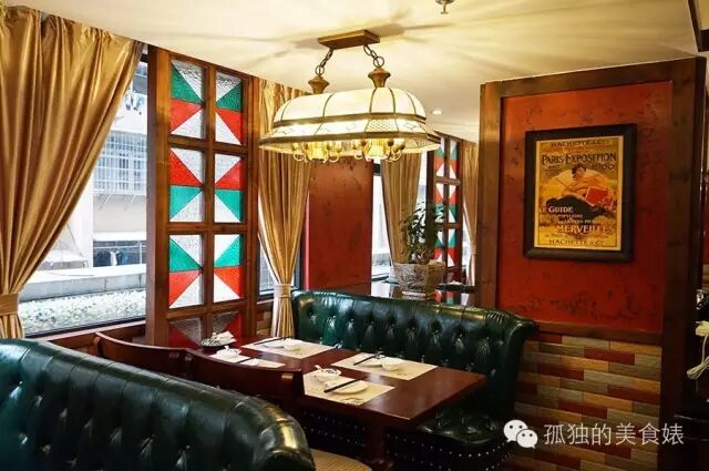 一走进醉江湖,仿佛穿越回到80年代,花窗红墙、墨绿色的皮沙发、金色吊灯,复古风的设计很正。