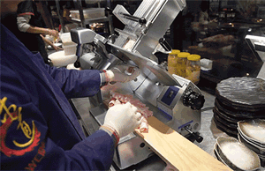 经过自动化设备和秘制处理,将羊肉薄切,